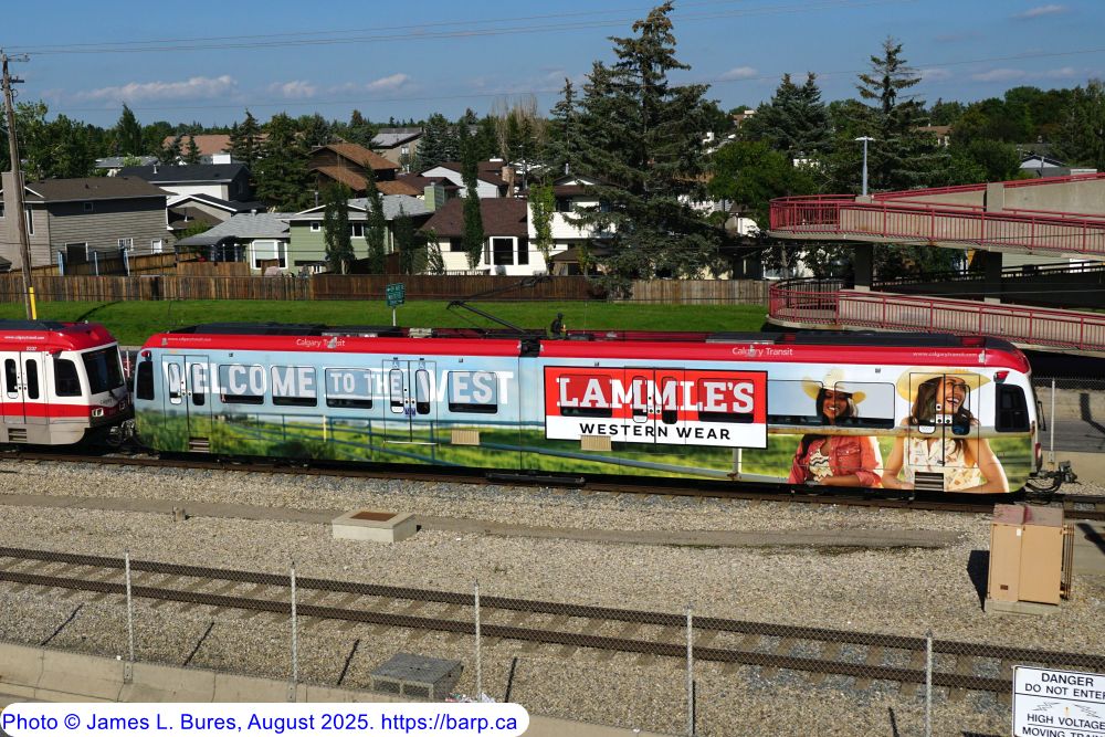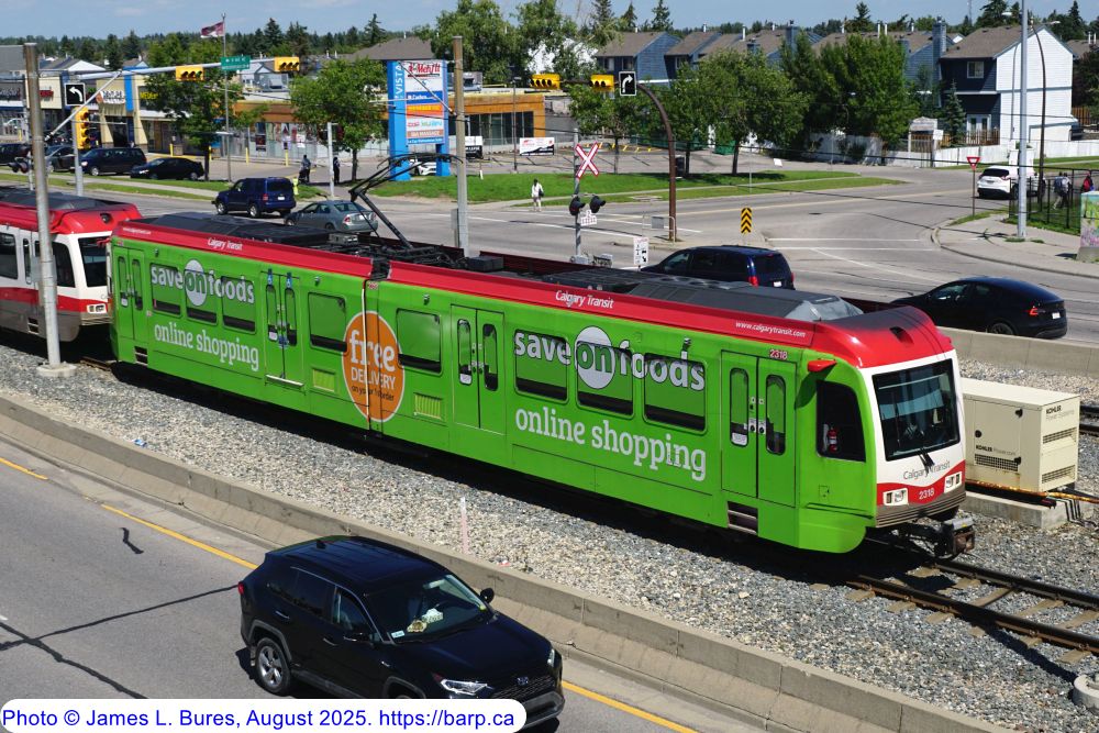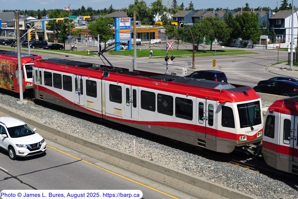 2307 departing Whitehorn Station NB, trailing a blue line consist destined for Saddletowne Station. |