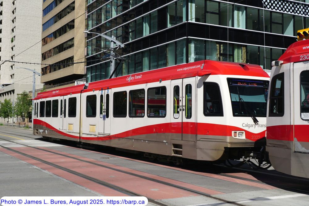2320 exiting 7th Avenue on the East side of downtown, leading a Blue Line consist destined for Saddletowne Station. |