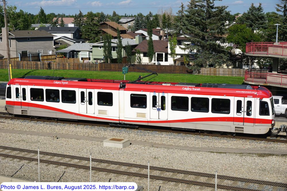 2330 departing Whitehorn Station NB, leading a blue line consist destined for Saddletowne Station. |