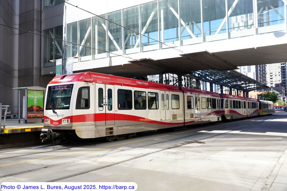 2333 exiting 7th Avenue on the East side of downtown, trailing a Blue Line consist destined for Saddletowne Station. |