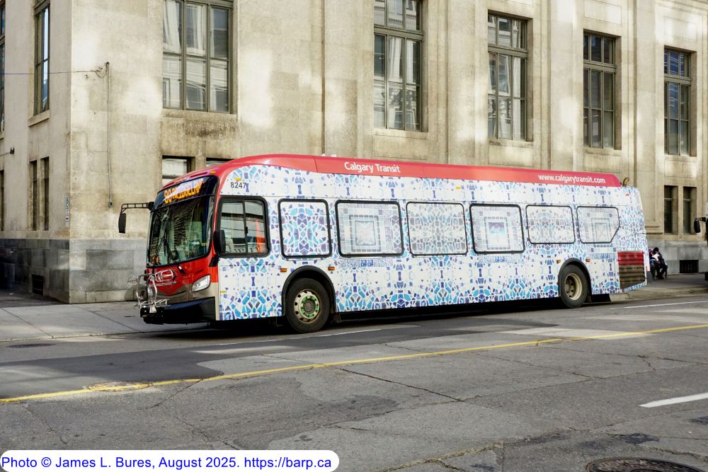 8247 parked NB on 1 Street SW at around 8 Avenue SW as a route 90, featuring a city-sponsored artwork wrap. |