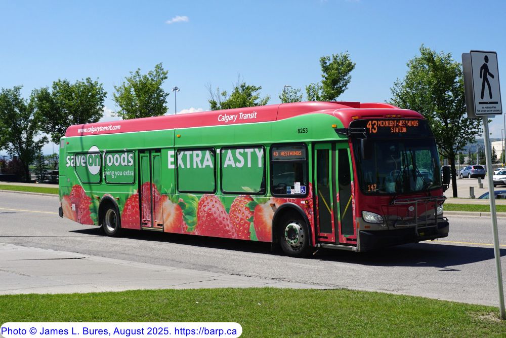 8253 arriving at McKnight-Westwinds Station as a route 43, featuring a wrap for Save On Foods. |