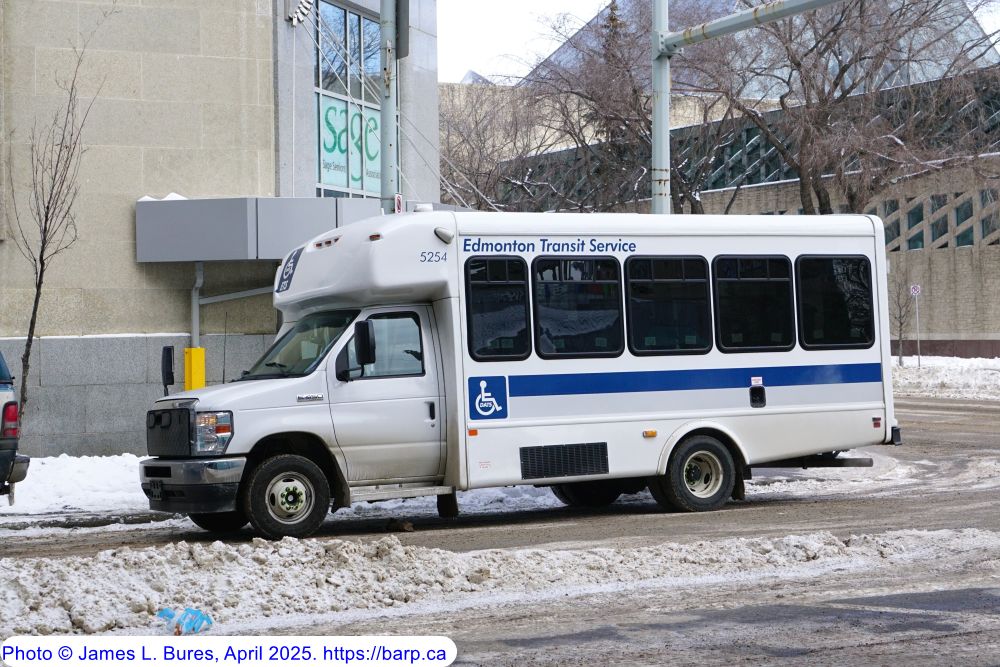 5254 waiting to load passengers on 102a Avenue WB at 100 Street. |