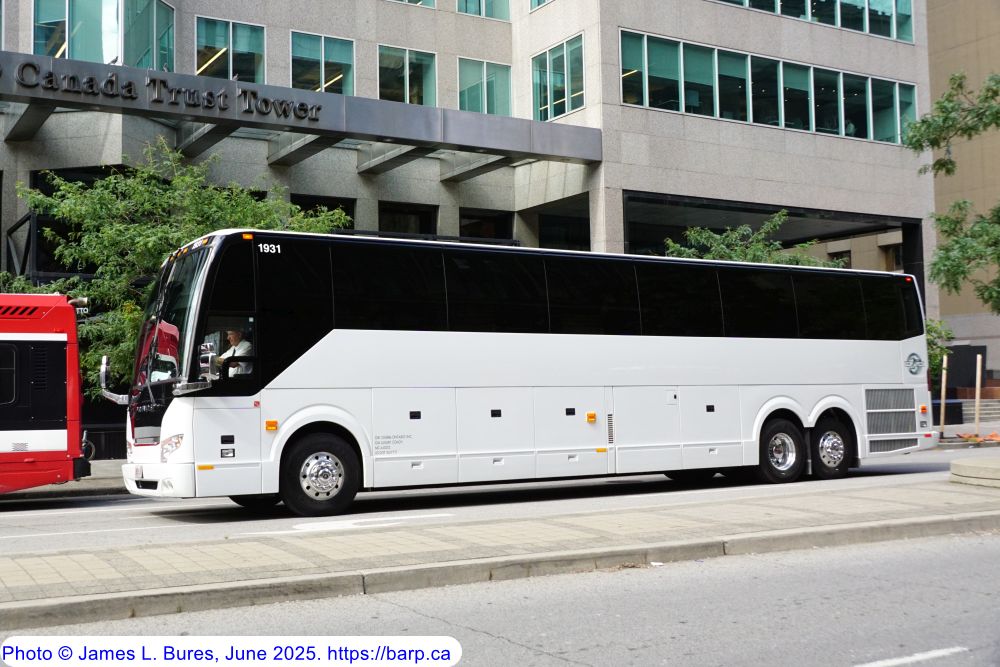 Prevost H3-45 shown parked on 9th Avenue SW at Centre Street in Calgary,