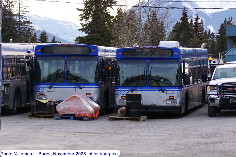 ETS 2001 D40LF #4260 and 2002 D40LF #4344 parked in the back of the service yard in the Banff industrial area. These buses could be parts sources or waiting to enter service when another unit dies. |