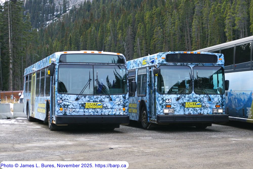 #45 waiting to enter service at the Sunshine base lodge. This bus is ex-Edmonton Transit Service #4294. |