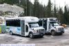 A brand new StarTrans Senator II (no visible fleet numbers yet) parked at the Sunshine base lodge along with Girardin G5 #70. |