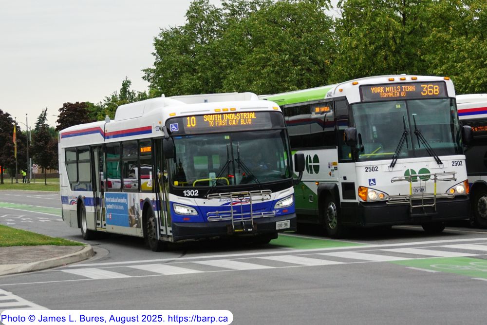 1302 running SB on Central Park Drive at Knightsbridge Road as a route 10, with GO Transit #2502 on the right. |