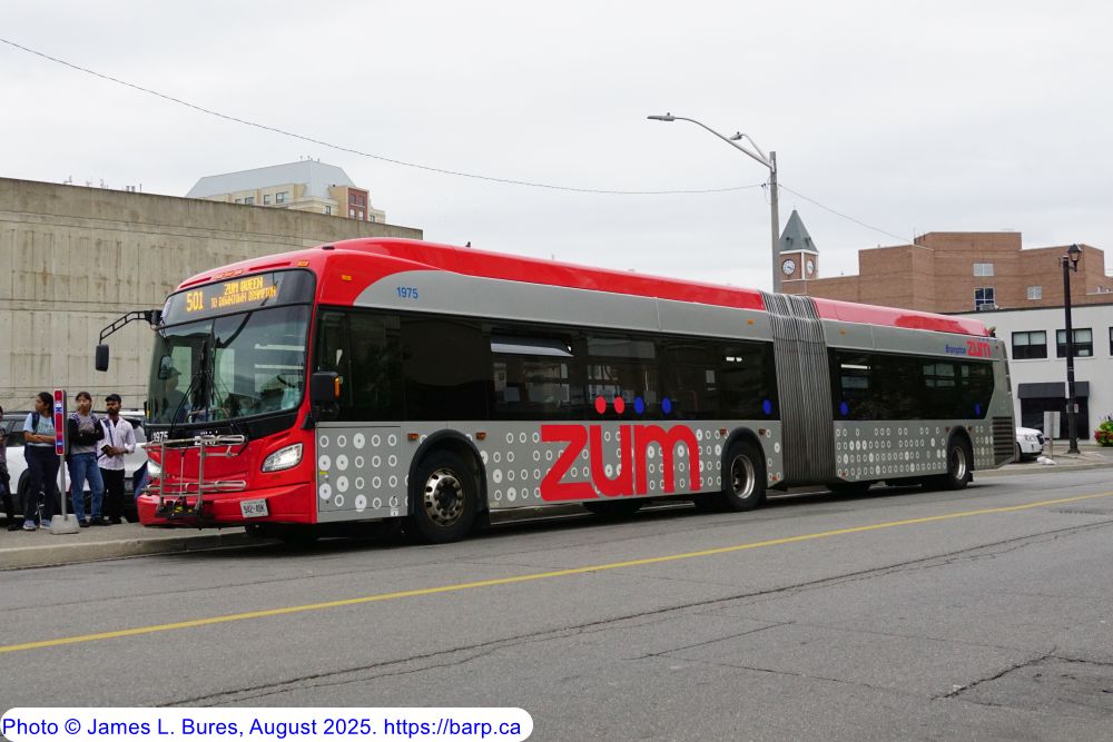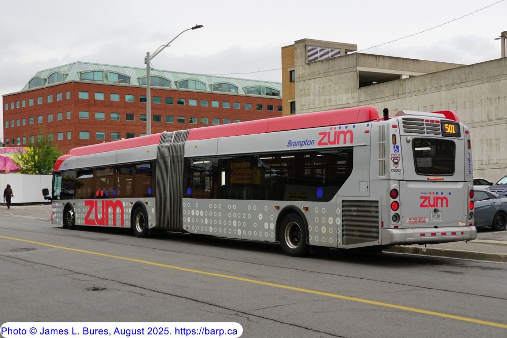 1975 at the temporary Downtown Terminal as a route 501. The terminal was under renovation at the time, so buses stopped on George Street N, North of Queen Street W.