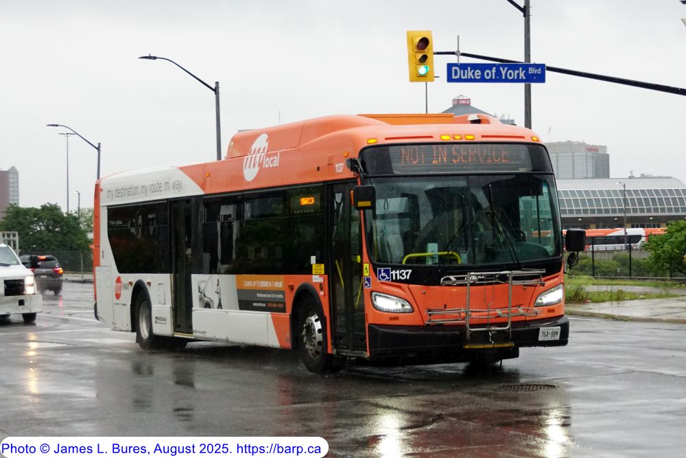 1137 not in service departing the Mississagua City Centre Terminal. |