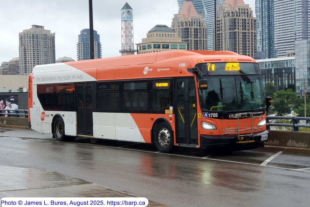 1705 at the Mississagua City Centre Terminal as a route 7N after being repainted into the orange livery. |
