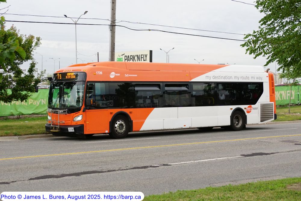 1726 running SB on Carlingview Drive at Meteor Drive as a route 7S after being repainted into the orange livery. |