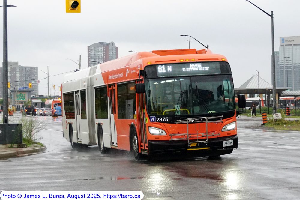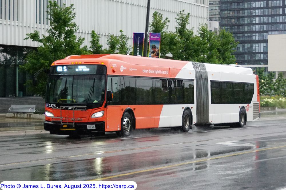 2375 arriving at the Mississauga City Centre Transit Terminal as a route 61S. The front and rear destination signs on these buses (Luminator Spectrum full color) are set to white mode for easier visibility. |