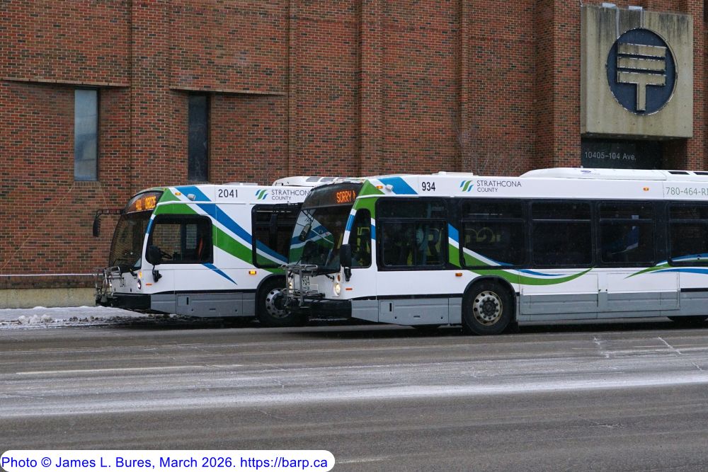Strathcona County Transit #934 and #2041 together on 104 Avenue EB at 104 Street in Downtown Edmonton. #2041 is part of a recently-delivered order of five Nova LFS (#2038-2042). #934, a 2007 model, is among the oldest examples operated by Strathcona in addition to being part of the last order of single door LFS suburban models. #2038-42 should presumably replace some of these remaining 2007's, however they continue in active service for now.